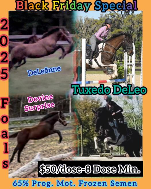 **Great Breeder Startup Package: Over 400 doses of High quality "Frozen" semen from our 3rd generation of Spotted Drafts. Mtn View Tuxedo DeLeo is Homozygous for Black (EE/Aa/Tt) and is negative for PSSM1 and WFFS. Proven sire of 2 Sport foals born in 2025. DeLeonne has sold.